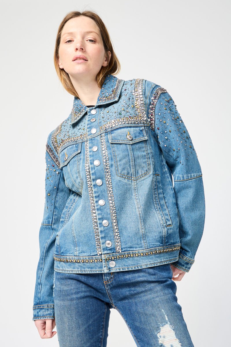 Empiècements en métal et strass sur le col, les manches, devant et au dos.