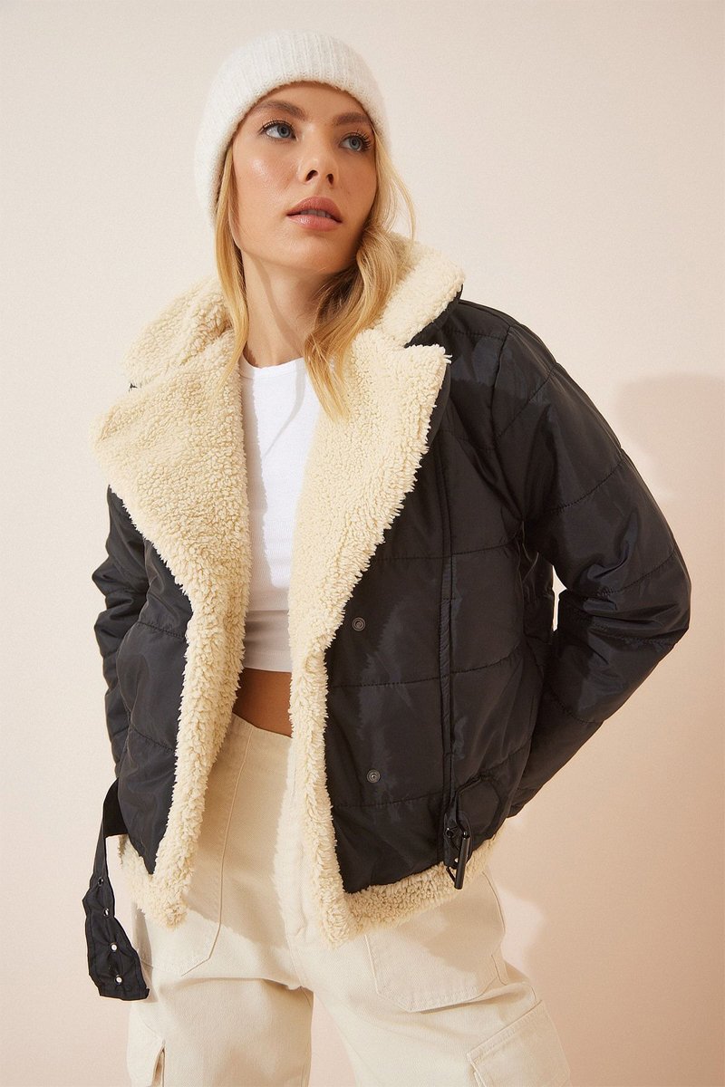 Fourrure synthétique à l'encolure, devant et à la base.
