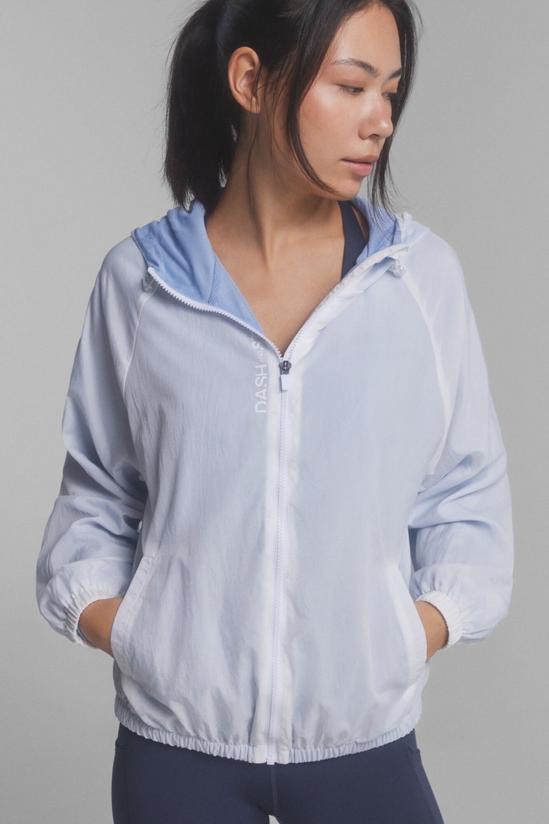 Coupe-vent à capuche avec liens de serrage et barillets.