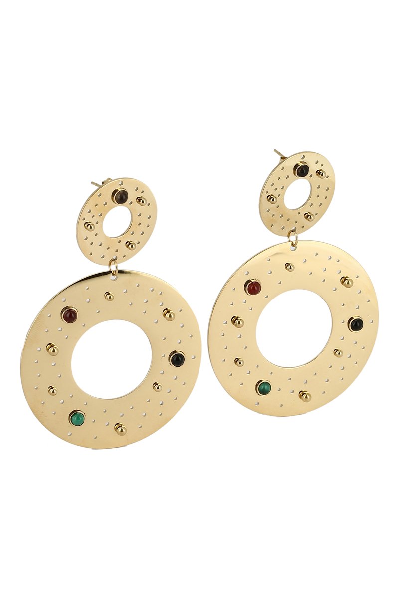 Boucles d’oreilles pendantes serties de quartz, cornalines, onyx et malachites.
