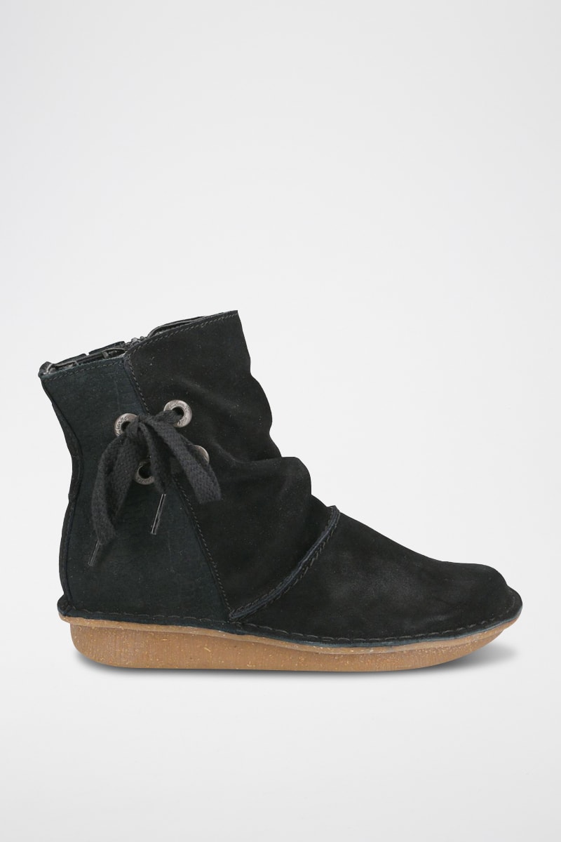 Fermeture zippée sur le côté intérieur et à lacets sur le côté extérieur.