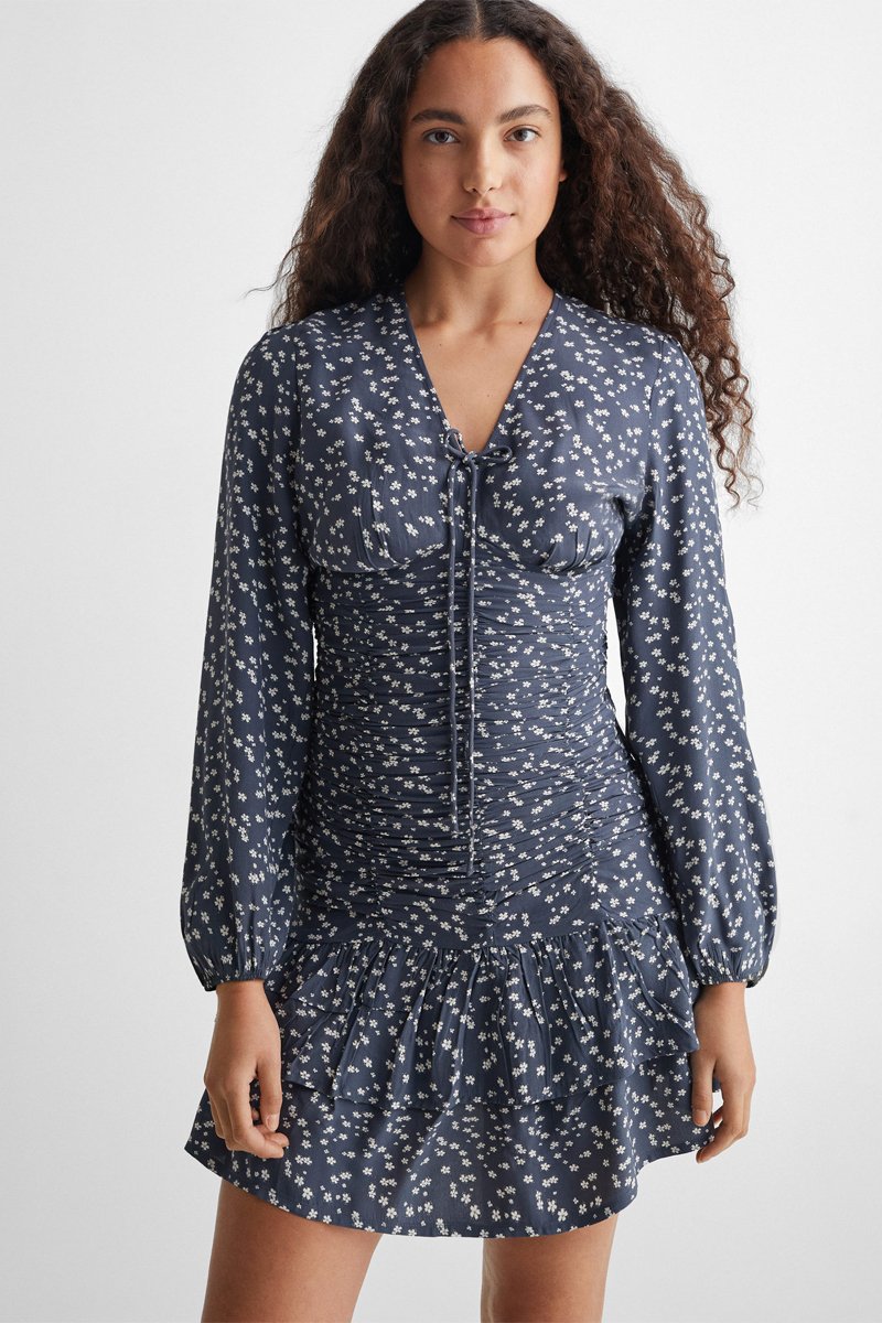 Robe fleurie froncée - Bleu marine