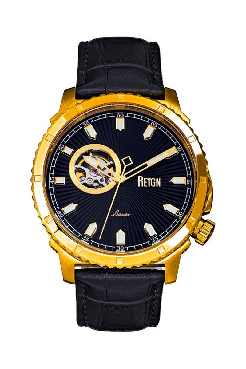 Montre automatique en cuir Bauer - Noir et doré