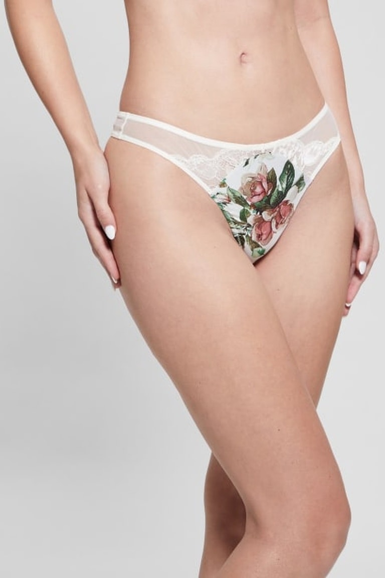 Motifs fleurs et empiècement en dentelle devant.