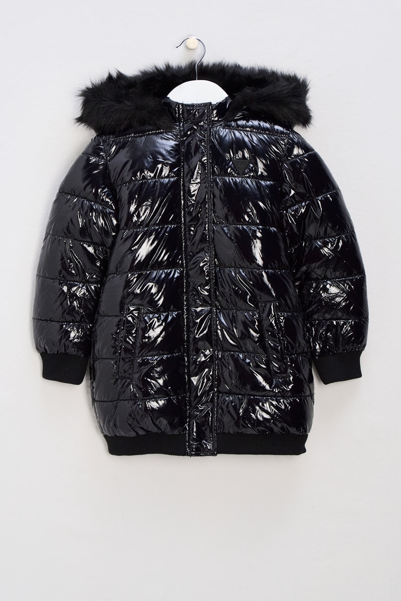 Doudoune longue à capuche avec fourrure synthétique.