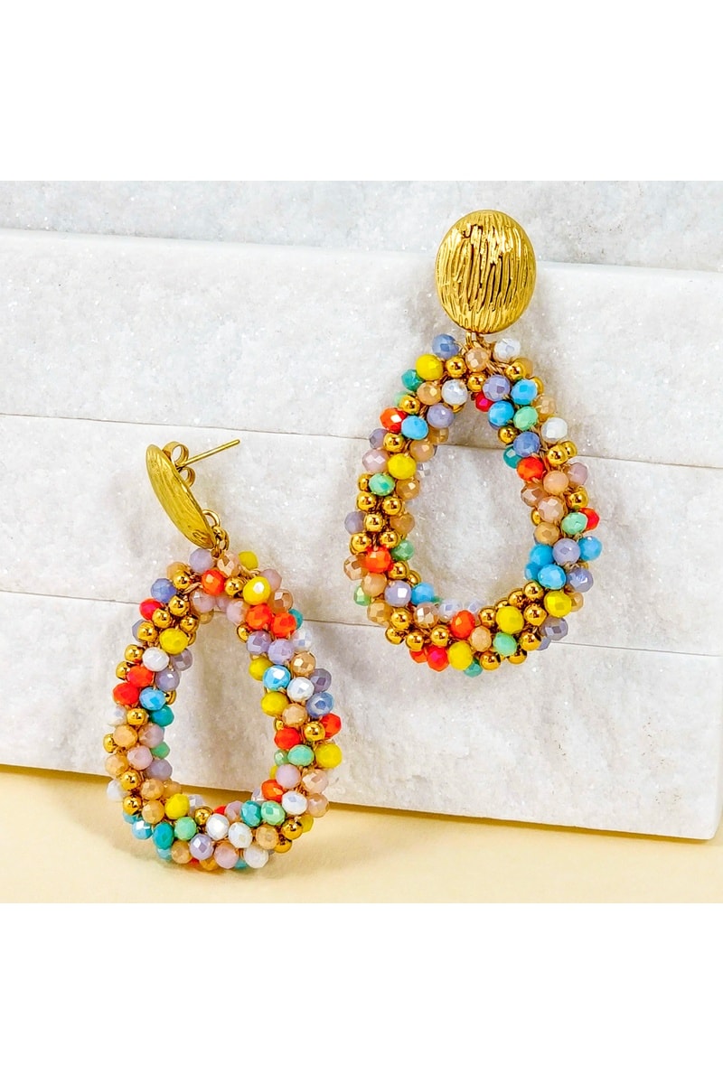 Boucles d’oreilles pendantes dorées à l’or fin jaune serties de cristaux.