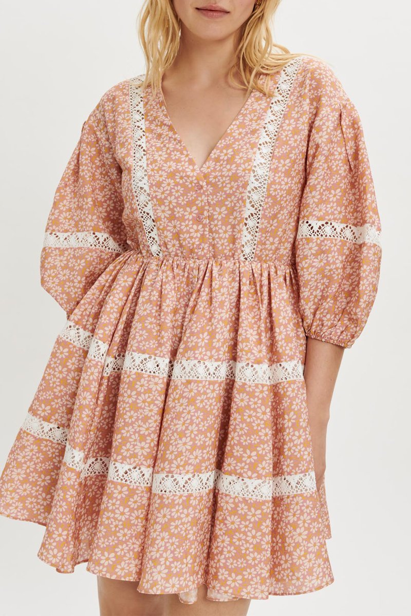 Empiècements en dentelle sur les manches, devant et sur la jupe.