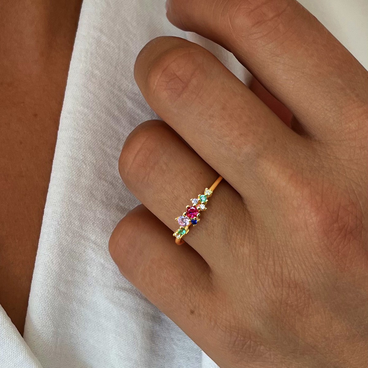 Avec cette bague, plongez dans une mosaïque de pierres précieuses qui se marient en parfaite harmonie. Le saphir, l'émeraude, l'améthyste et le rubis s'unissent pour créer un spectacle de couleurs éblouissant.