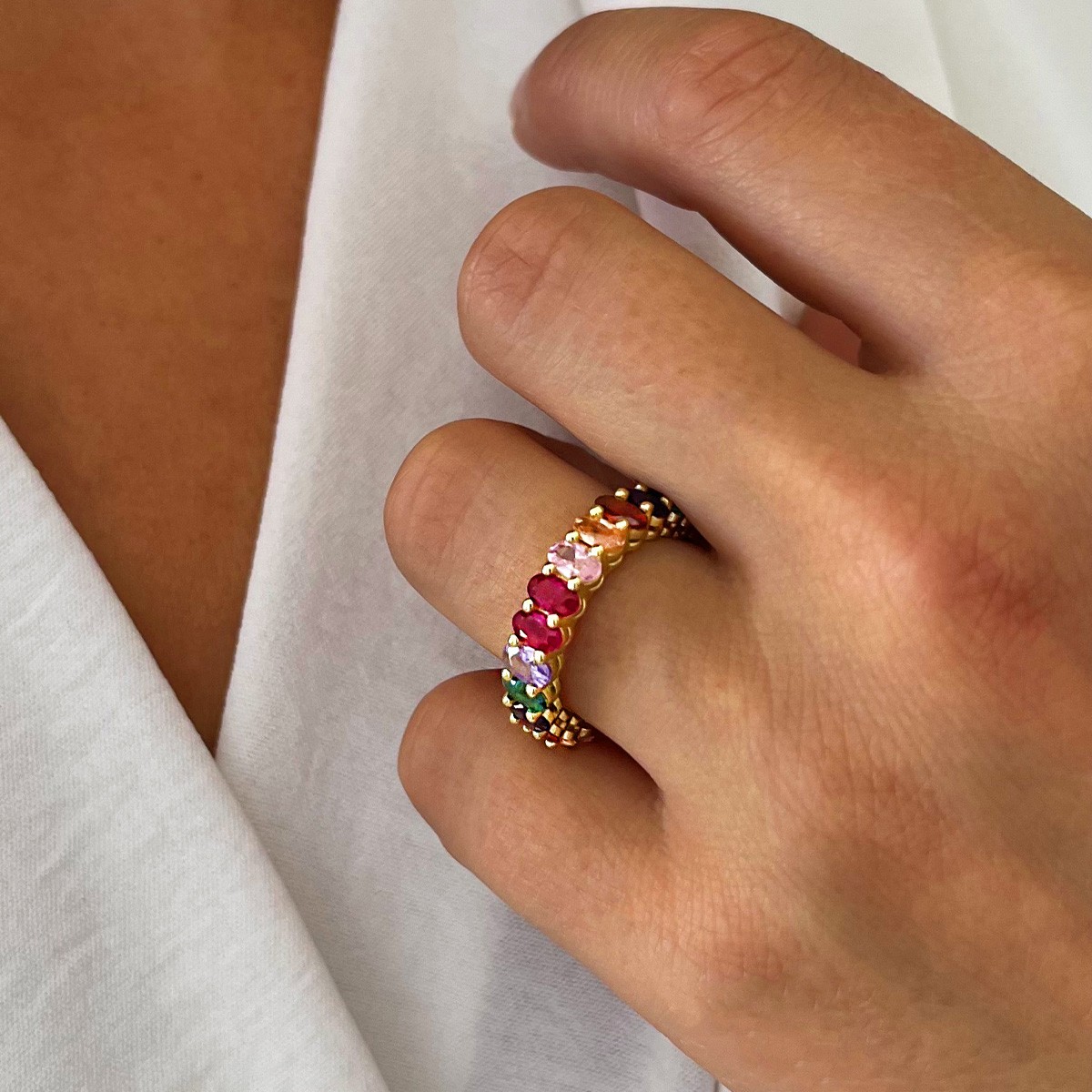 Avec cette bague, plongez dans une mosaïque de pierres précieuses qui se marient en parfaite harmonie. Le saphir, l'émeraude, l'améthyste et le rubis s'unissent pour créer un spectacle de couleurs éblouissant.