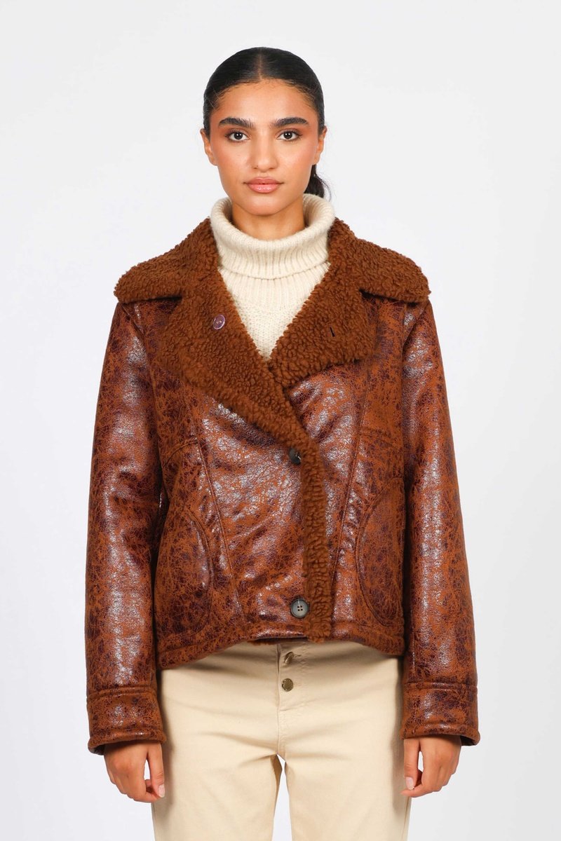 Col tailleur en fourrure synthétique avec empiècement en métal.