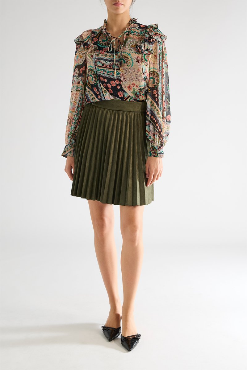 Jupe plissée en velours taille haute - Kaki
