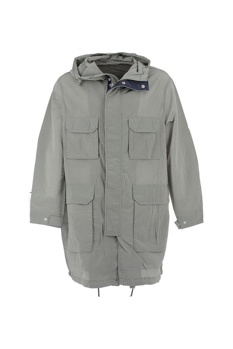 Trench à capuche avec liens de serrage et barillets.
