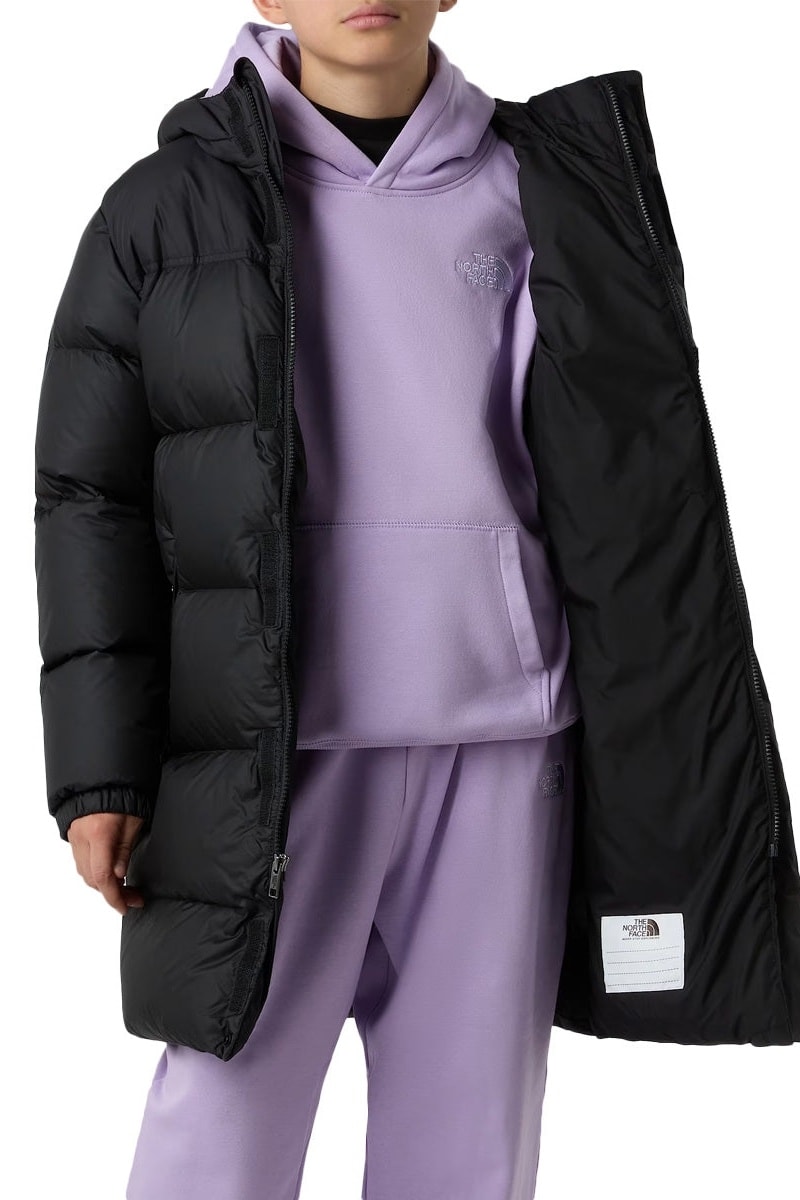 Doudoune longue de randonnée à capuche.