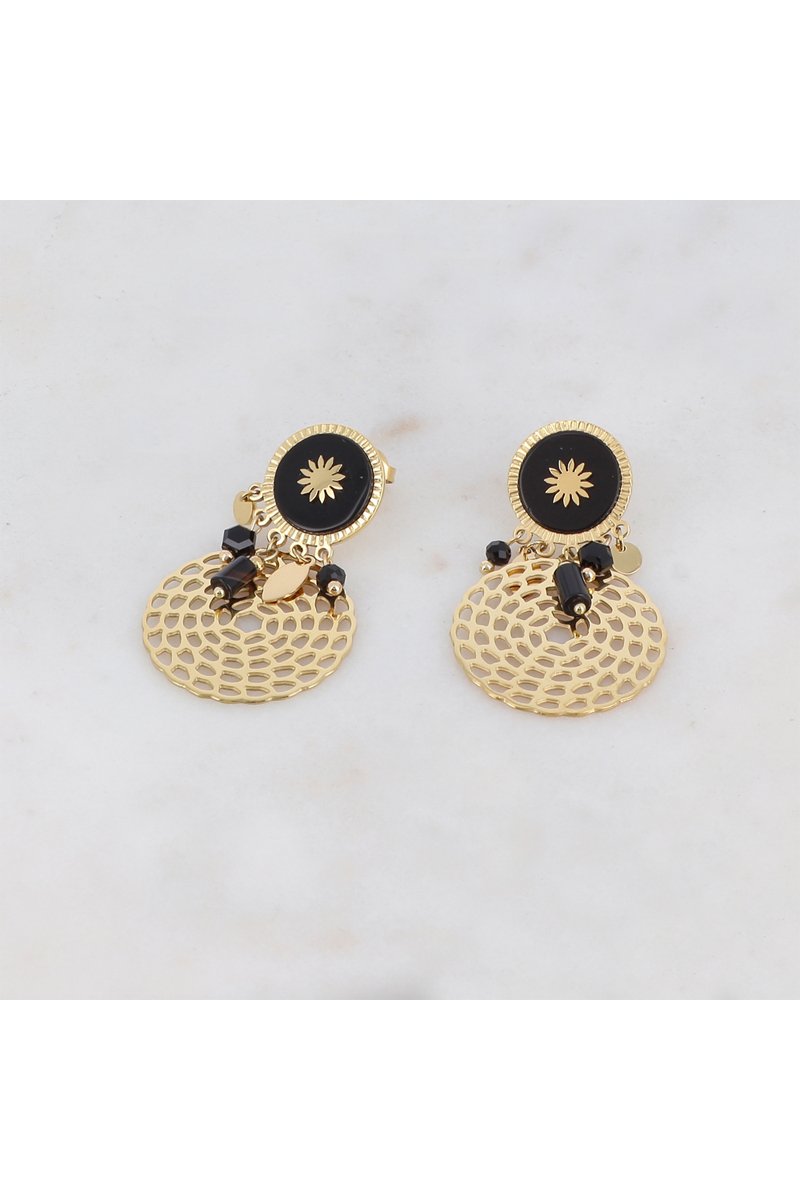 Boucles d'oreilles pendantes serties d' onyx et de pâtes de verre.