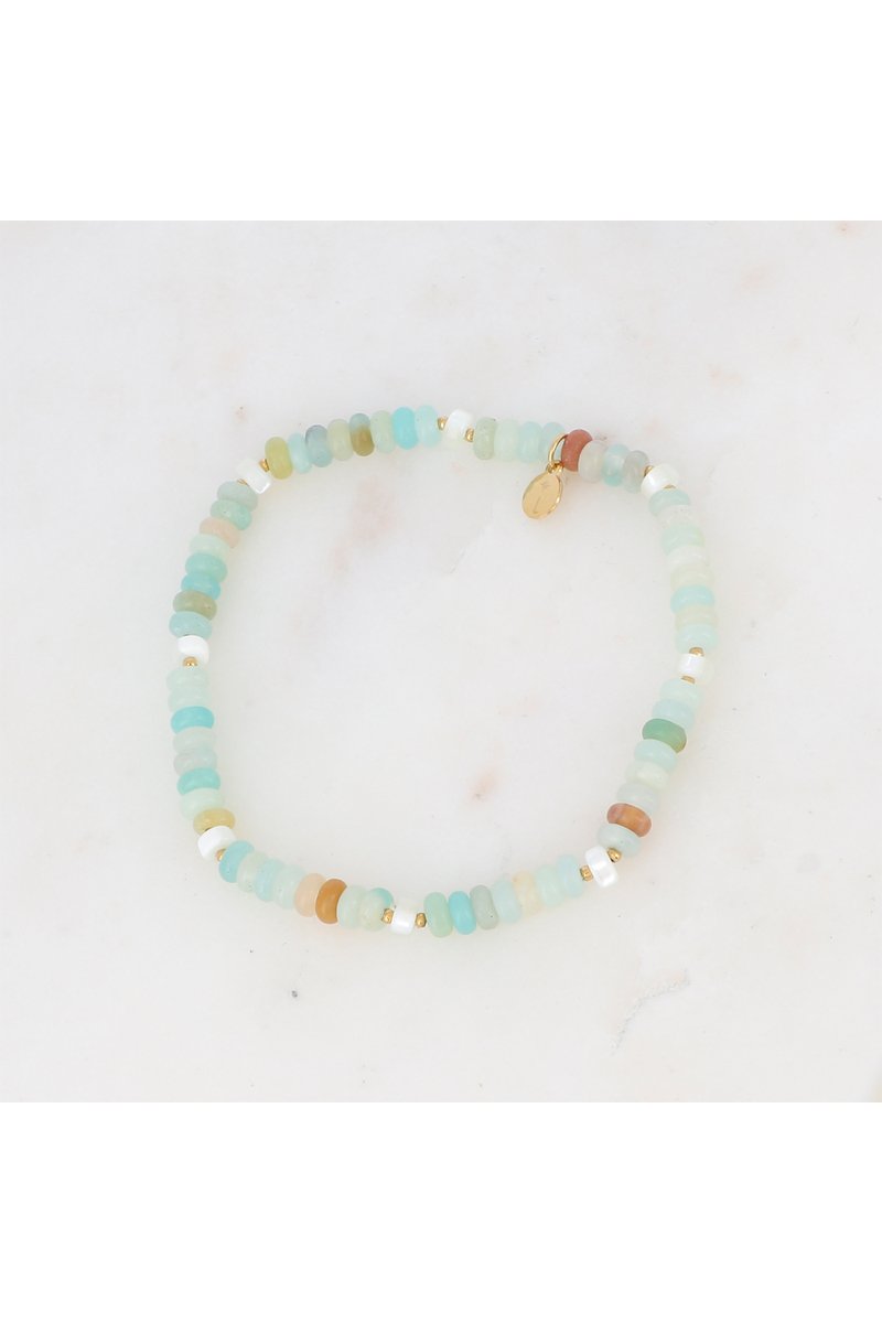 Bracelet élastique serti d’amazonites et nacre.