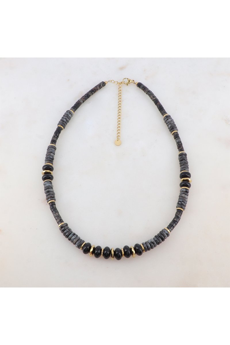 Collier serti de labradorites, d'onyx et d'howlites.