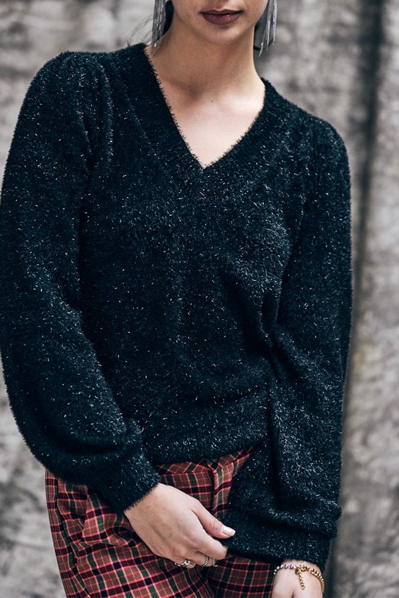 Pull fantaisie en maille doudou noir et lurex.
