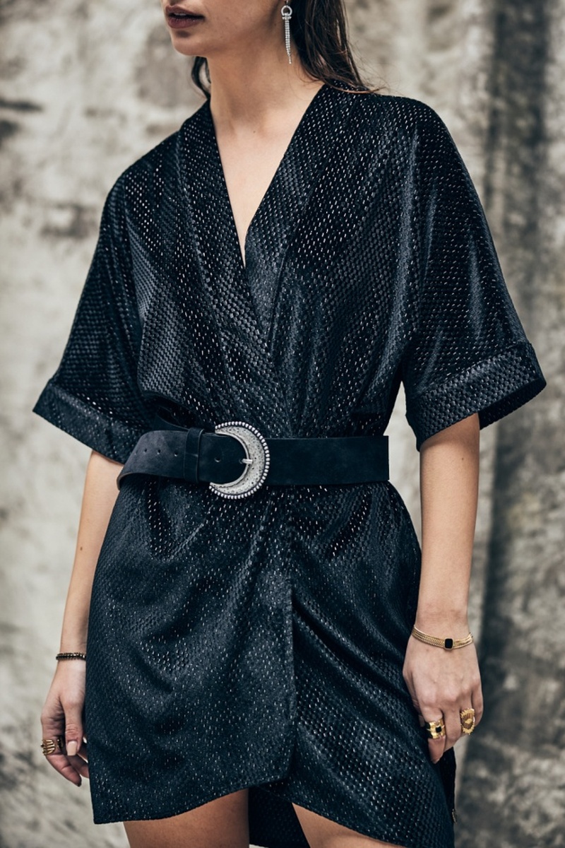 Robe courte esprit kimono dans un tissu velours noir avec détails dorés.