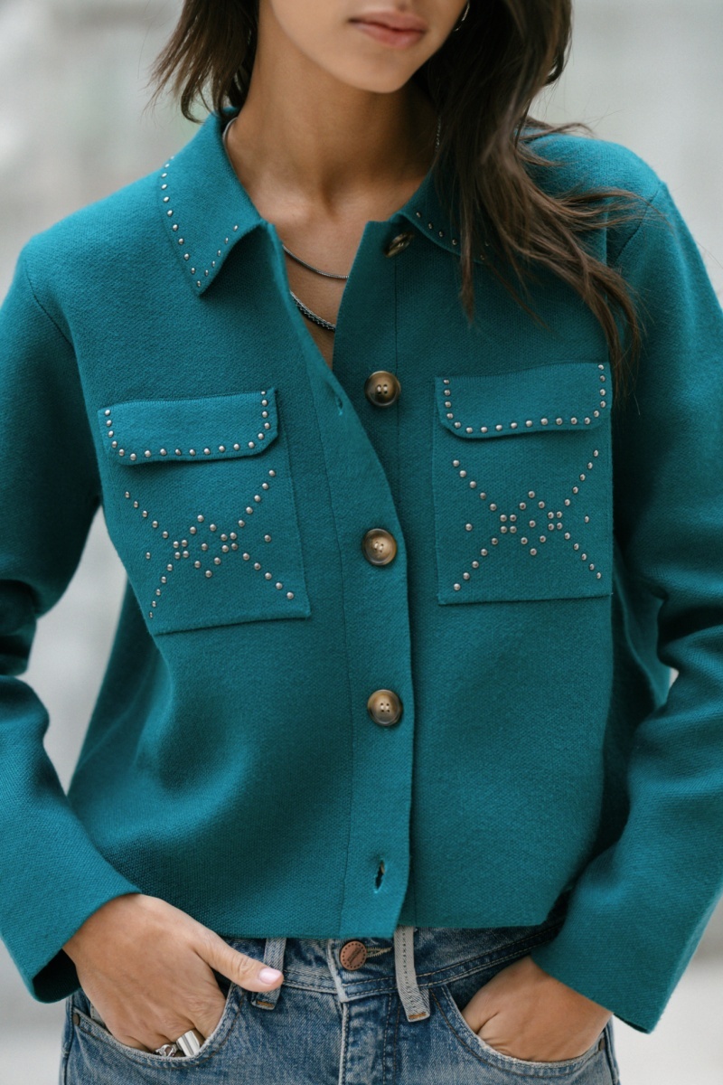 Détails clous sur le col et les poches.