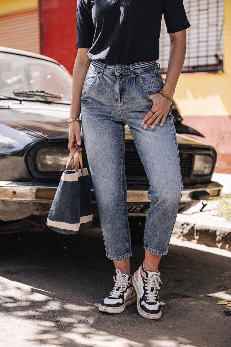 Jean mom 7/8 taille haute Natasha - Blanc, noir et bleu