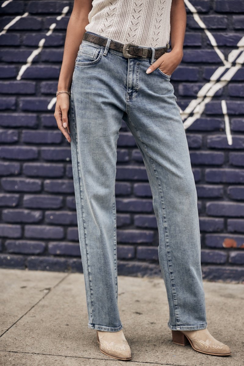 Délavage bleu moyen, usé, esprit authentique.