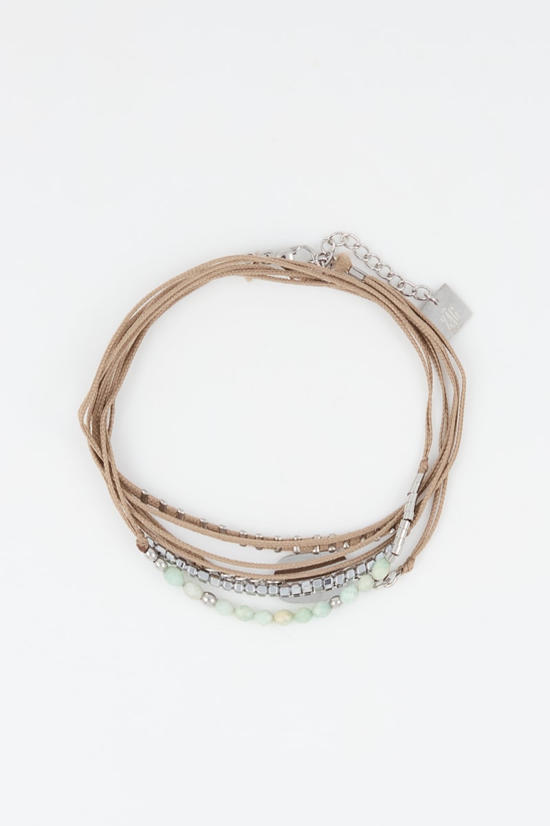 Bracelet multi rangs serti de 11 amazonites et de perles d’imitation.