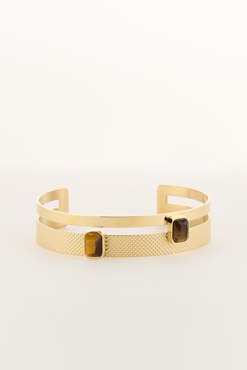 Jonc ouvert serti d’un œil-de-tigre et d'un quartz.
