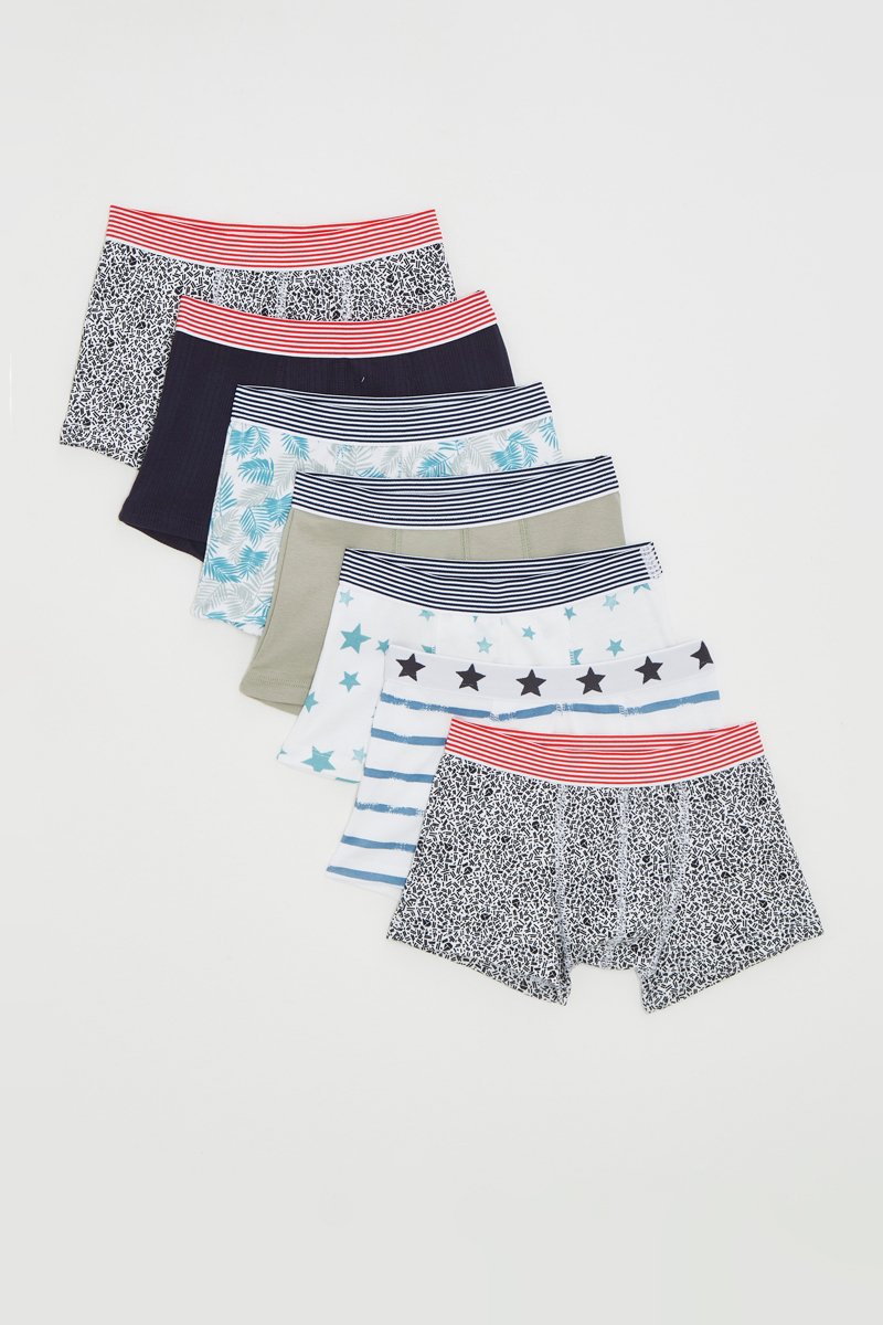 7 boxers dont 2 à motifs fantaisie, 1 à motifs feuilles, 1 à motifs à rayures et 1 à motifs étoiles.