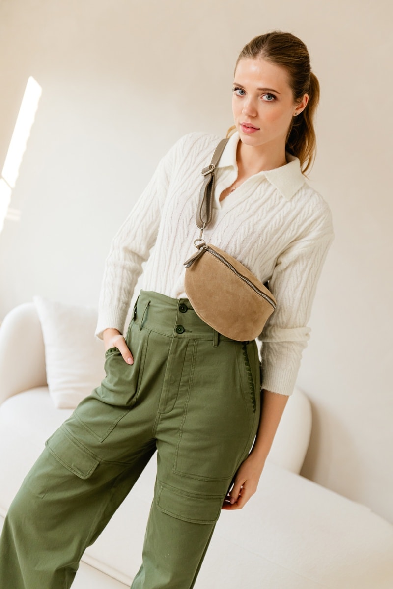 Sac banane transformable en sac bandoulière en nubuck et cuir grainé.